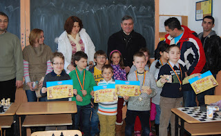 Sâmbătă au început şi competiţiile Danone pentru copii: grădiniţă, începători, sub 10 ani şi 11-12 ani. Nu a putut participa toată lumea, mulţi trebuind să renunţe la turneu pentru că duminică trebuie să ajungă deja la Călimăneşti – Căciulata unde încep Campionatele Naţionale Individuale de juniori.  Vă dau tot un link, să vedeţi cine participă dintre clujeni sau cunoscuţi. Simultan se desfăşoară la Iaşi campionatul mondial interşcolar. În concluzie, multă lume bună (fetele au fost favorizate, nefiind aşa concurenţa n-a existat anul trecut rundă preliminară) n-a putut fi prezentă dar acest lucru nu înseamnă că disputele n-au fost aprinse – categoria grădiniţă cu 28 participanţi fiind de departe cea mai numeroasă şi gălăgioasă. Nu pot da decât clasamentele finale la grădiniţă şi începători, aceste concursuri terminându-se sâmbătă. Pentru explicaţii despre ierarhizarea copiilor cu acelaşi număr de puncte pe bază de Bucholz (care ţine cont de valoarea şi rezultatele adversarilor), puteţi căuta pe internet, consider că este suficient dacă spun că acesta este modul de ierarhizare şi la competiţiile profesioniste. S-au dat multe medalii de către organizatori şi diplome la toţi copiii, ştiindu-se ce important este pentru copii să fie răsplătiţi pentru efortul considerabil pe care l-au făcut pentru vârsta lor – 5 runde în aceeaşi zi.